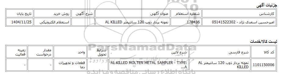 | امیرحسین اسعدی نژاد - 05141522302 | 178436 | نمونه بردار ذوب 120 سانتیمتر AL KILLED | استعلام الکترونیکی | 1404/11/25 |
