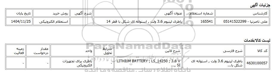 | علی ناصرنیا - 05141522299 | 165541 | باطری لیتیوم 3.6 ولت , استوانه ای شکل با قطر 14 | استعلام الکترونیکی | 1404/11/25 |