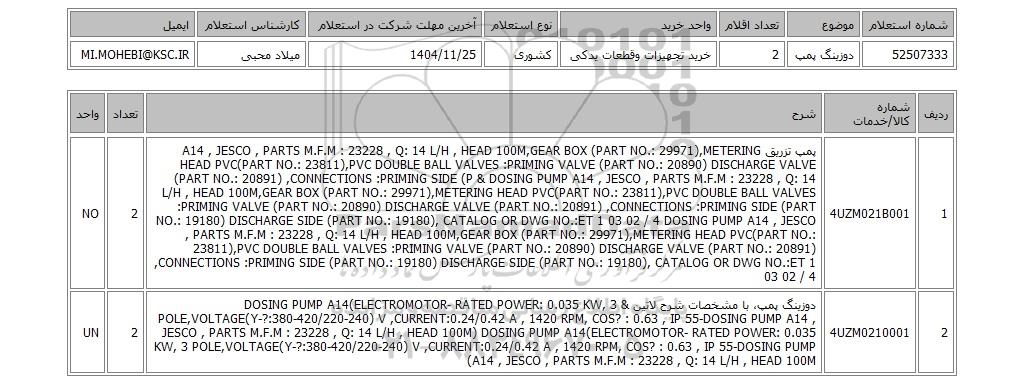 | 52507333 | دوزینگ پمپ | 2 | خرید تجهیزات وقطعات یدکی | کشوری | 1404/11/25 | میلاد محبی | MI.MOHEBI@KSC.IR |