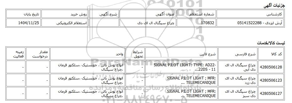 | آرش ایزدی - 05141522288 | 170832 | چراغ سیگنال ال ای دی | استعلام الکترونیکی | 1404/11/25 |