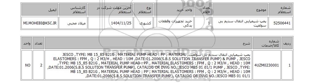 | 52506441 | پمپ شیمیایی انتقال سدیم بی سولفیت | 1 | خرید تجهیزات وقطعات یدکی | کشوری | 1404/11/25 | میلاد محبی | MI.MOHEBI@KSC.IR |