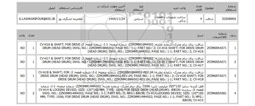 | 52508900 | شافت | 4 | ساخت تجهیزات و قطعات یدکی | استانی | 1404/11/24 | غلامرضا لشگری پور | G.LASHKARIPOUR@KSC.IR |