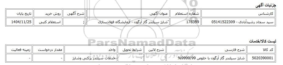 | سید سجاد رشیدآبادی - 05141522309 | 178359 | َشارژ سیلندر گاز آرگون - آزمایشگاه فولادسازی | ; | استعلام کتبی | 1404/11/25 |