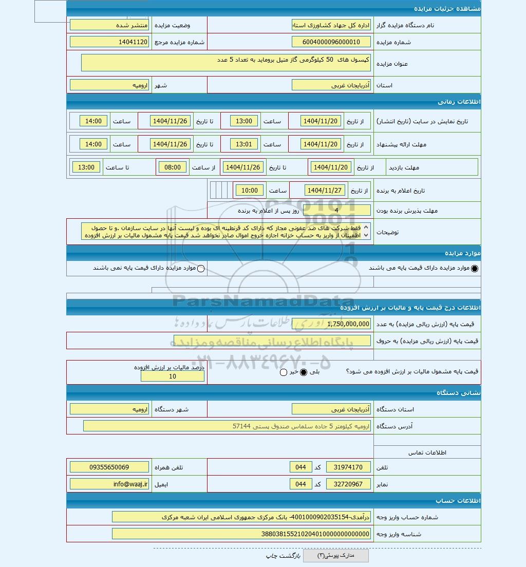 | نام دستگاه مزایده گزار | اداره کل جهاد کشاورزی استان اذربایجان غربی | وضعیت مزایده | منتشر شده | |