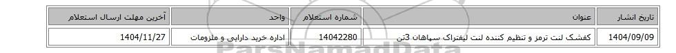 | 1404/09/09 | کفشک لنت ترمز و تنظیم کننده لنت لیفتراک سپاهان 3تن | 14042280 | اداره خرید دارایی و ملزومات | 1404/11/27 |
