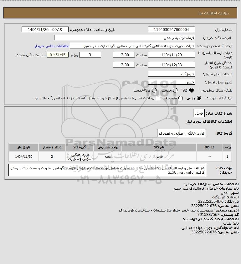 استعلام بها و موضوع استعلام استعلام فرش به اطلاع کلیه شرکت‌ها و افراد متخصص واجد شرایط می‌رساند، آگهی گذار در نظر دارد از طریق استعلام بها، نسبت به انتخاب و دریافت پیشنهادات اقدام نماید. این استعلام با کد آگهی ثبت شده در سامانه خبرگزاری پارس نماد : 10304202 منتشر شده است. مشخصات استعلام : تاریخ شروع استعلام: 1404/11/26 آخرین مهلت ارسال پیشنهاد قیمت : 1404/11/29 و محل اجرای پروژه : استان مناقصات استان هرمزگان میباشد. استعلام قیمت مورد درخواست : استعلام فرش با دسته‌بندی‌های تخصصی و گروه های مرتبط : لوازم خانگی, فرش و موکت, استعلام اطلاع رسانی میگردد.