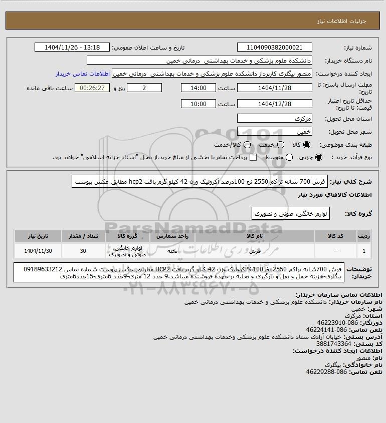 شرح کلی نیاز: فرش 700 شانه تراکم 2550 نخ 100درصد آکرولیک وزن 42 کیلو گرم بافت hcp2 مطابق عکس پیوست