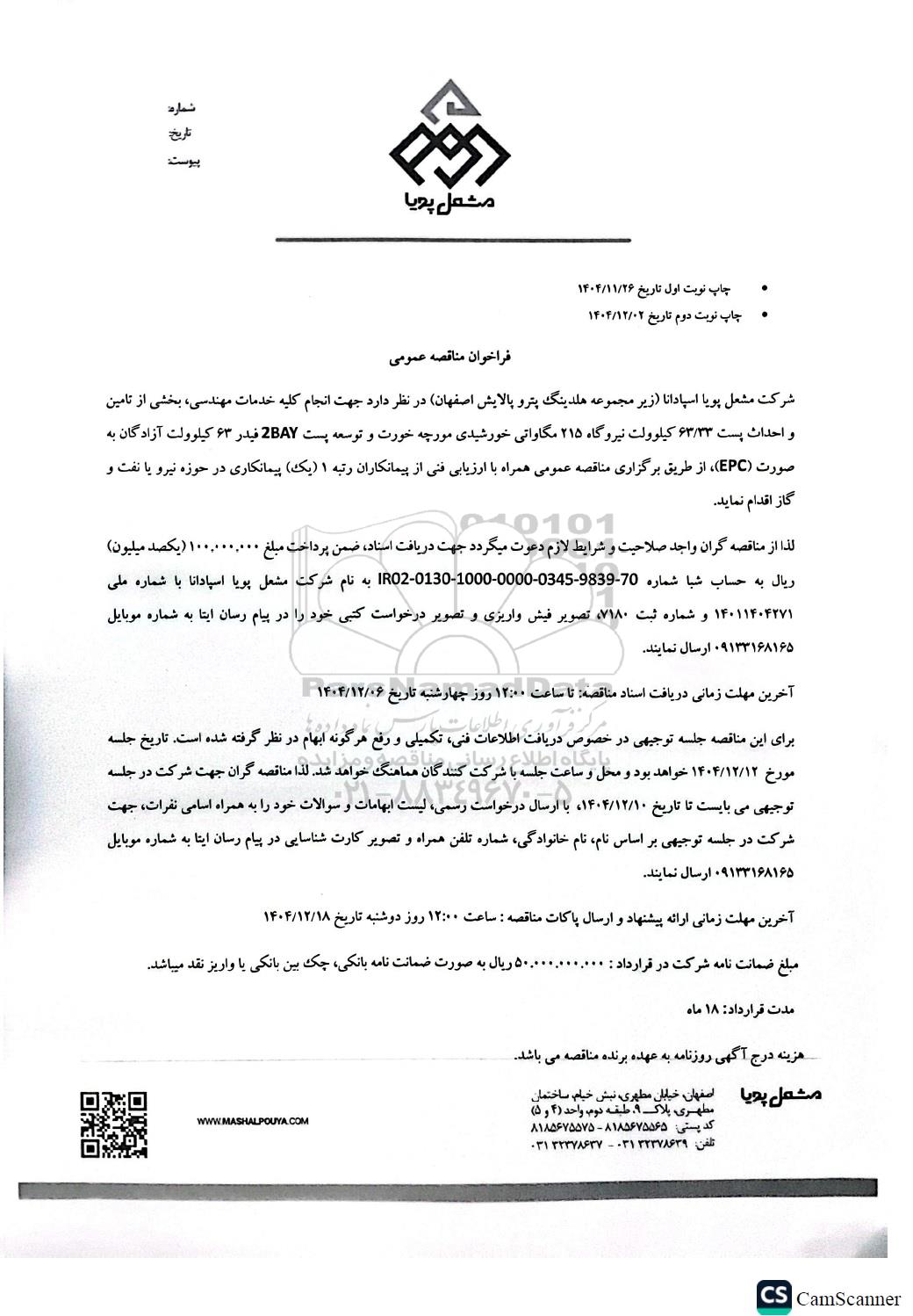 شرکت مشعل پویا اسپادانا (زیرمجموعه هلدینگ پترو پالایش اصفهان) در نظر دارد جهت انجام کلیه خدمات مهندسی، بخشی از تامین و احداث پست 63.33 کیلوولت نیروگاه 215 مگاواتی خورشیدی مورچه خورت و توسعه پست 2BAY فیدر 63 کیلوولت آزادگان به صورت (EPC) از طریق برگزاری مناقصه عمومی همراه با ارزیابی فنی از پیمانکاران رتبه 1 (یک) پیمانکاری در حوزه نیرو یا نفت و گاز اقدام نماید.