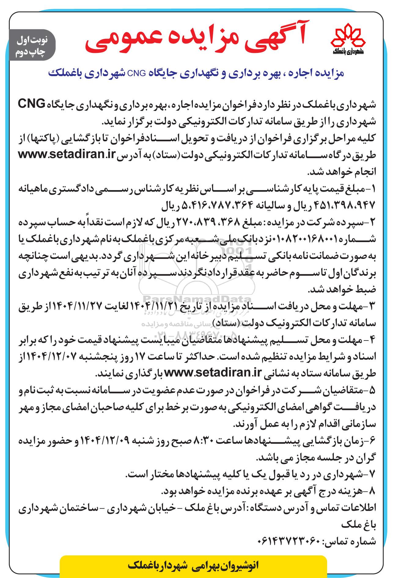 شهرداری باغملک در نظر دارد فراخوان مزایده اجاره، بهره برداری و نگهداری جایگاه CNG شهرداری را از طریق سامانه تدارکات الکترونیکی دولت برگزار نماید.
