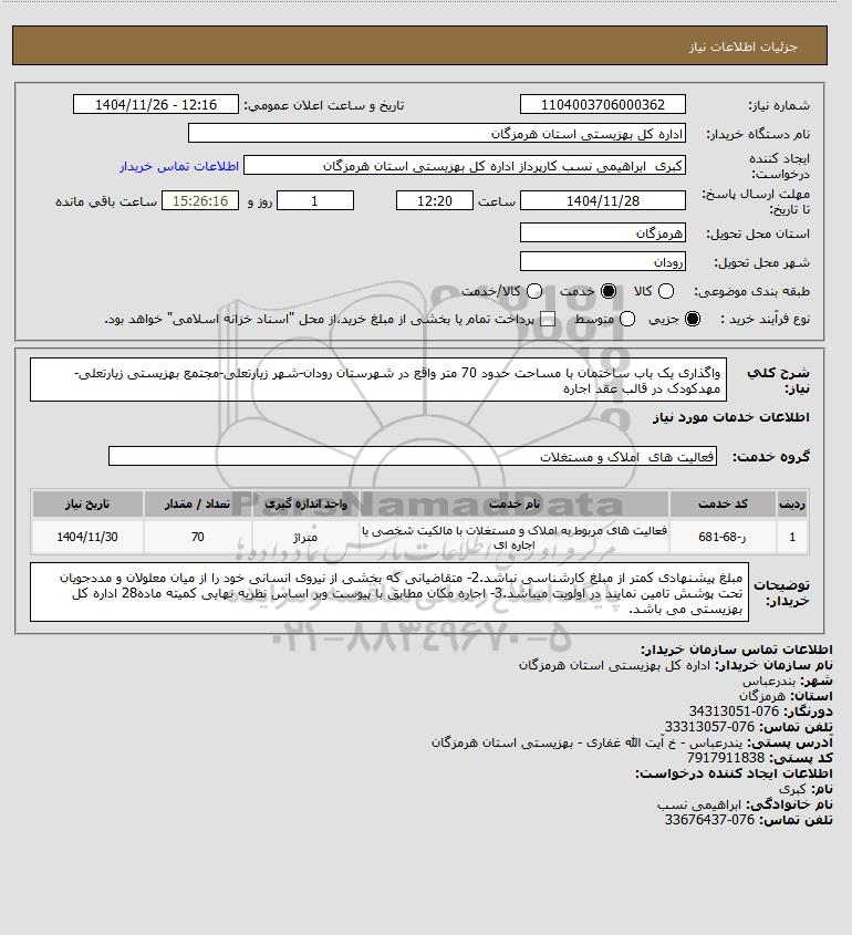 شرح کلی نیاز: واگذاری یک باب ساختمان با مساحت حدود 70 متر واقع در شهرستان رودان-شهر زیارتعلی-مجتمع بهزیستی زیارتعلی-مهدکودک در قالب عقد اجاره
