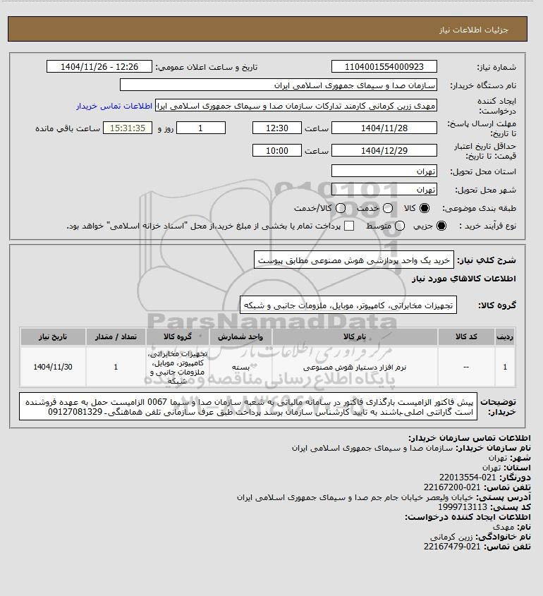 نام دستگاه خریدار:سازمان صدا و سیمای جمهوری اسلامی ایران