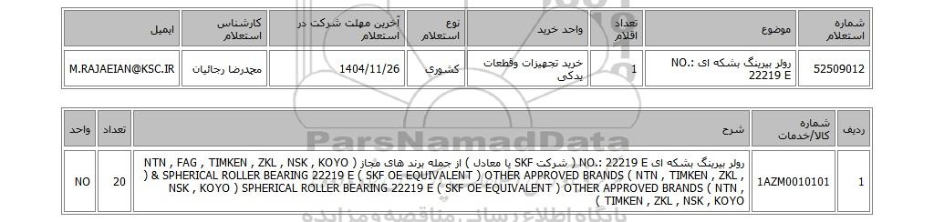 | 52509012 | رولر بیرینگ بشکه ای NO.: 22219 E | 1 | خرید تجهیزات وقطعات یدکی | کشوری | 1404/11/26 | محمدرضا رجائیان | M.RAJAEIAN@KSC.IR |