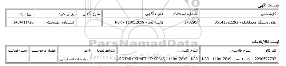 | علی رستگار محمدآبادی - 05141522292 | 178295 | کاسه نمد - NBR - 110x128x9 | استعلام الکترونیکی | 1404/11/26 |