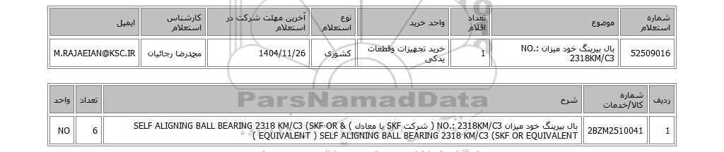 | 52509016 | بال بیرینگ خود میزان NO.: 2318KM/C3 | 1 | خرید تجهیزات وقطعات یدکی | کشوری | 1404/11/26 | محمدرضا رجائیان | M.RAJAEIAN@KSC.IR |