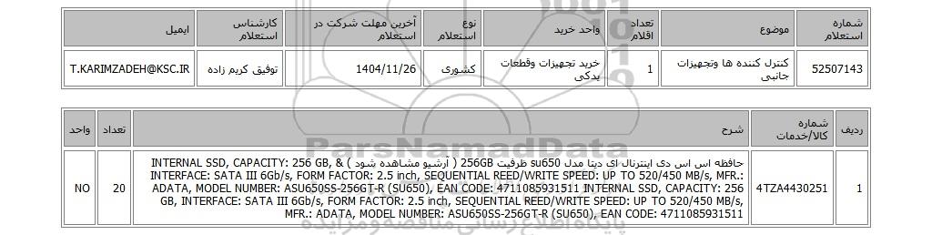| 52507143 | کنترل کننده ها وتجهیزات جانبی | 1 | خرید تجهیزات وقطعات یدکی | کشوری | 1404/11/26 | توفیق کریم زاده | T.KARIMZADEH@KSC.IR |