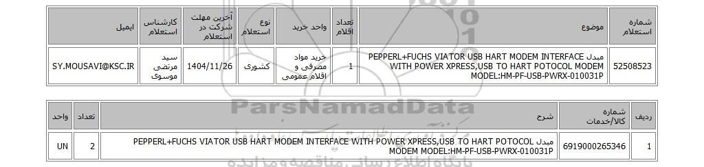 | 52508523 | مبدل PEPPERL+FUCHS VIATOR USB HART MODEM INTERFACE WITH POWER XPRESS,USB TO HART POTOCOL MODEM MODEL:HM-PF-USB-PWRX-010031P | 1 | خرید مواد مصرفی و اقلام عمومی | کشوری | 1404/11/26 | سید مرتضی موسوی | SY.MOUSAVI@KSC.IR |