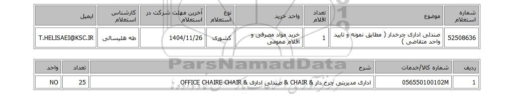 | 52508636 | صندلی اداری چرخدار ( مطابق نمونه و تایید واحد متقاضی ) | 1 | خرید مواد مصرفی و اقلام عمومی | کشوری | 1404/11/26 | طه هلیسائی | T.HELISAEI@KSC.IR |
