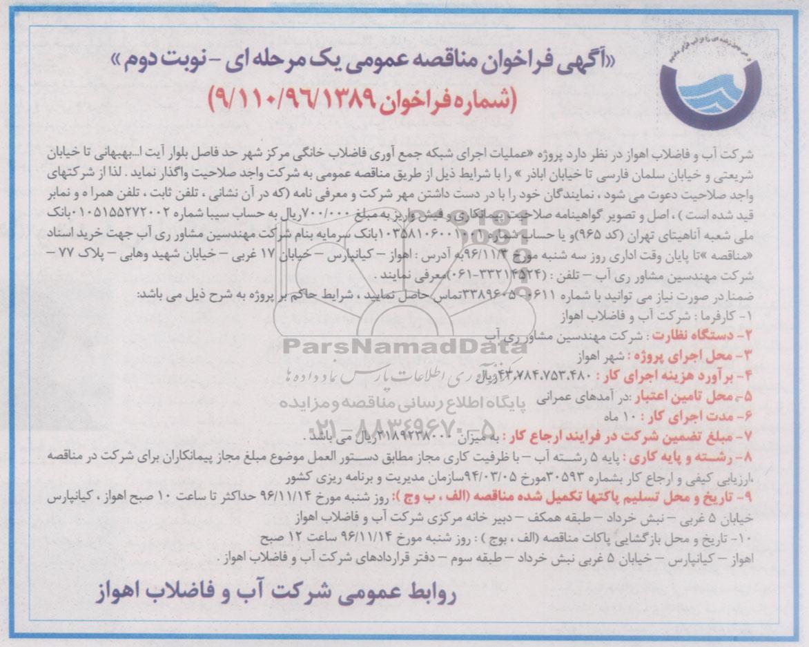 شرکت آب و فاضلاب اهواز به عنوان دستگاه مناقصه گزار در نظر دارد پروژه عملیات اجرای شبکه جمع آوری فاضلاب خانگی مرکز شهر حد فاصل بلوار آیت ا... بهبهانی تا خیابان شریعتی و خیابان سلمان فارسی تا خیابان اباذر را با شرایط ذیل از طریق مناقصه عمومی به شرکت واجد صلاحیت واگذار نماید لذا از شرکت های واجد صلاحیت دعوت می شود، نمایندگان خود را با در دست داشتن مهر شرکت و معرفی نامه (که در آن نشانی، تلفن ثابت، تلفن همراه و نمابر قید شده است)، اصل و تصویر گواهینامه صلاحیت پیمانکاری و فیش واریز به مبلغ 700.000 ریال به حساب سیبا شماره 0105155272002 بانک ملی شعبه آناهیتای تهران (کد 965) و یا به حساب شماره 10358106001001 بانک سرمایه به نام شرکت مهندسین مشاور ری آب جهت خرید اسناد «مناقصه» تا پایان وقت اداری روز 3شنبه مورخ 96.11.3 به آدرس اهواز، کیانپارس، خیابان 17 غربی، خیابان شهید وهابی، پلاک 77 ، شرکت مهندسین مشاور ری آب تلفن 33214524-061 معرفی نمایند.