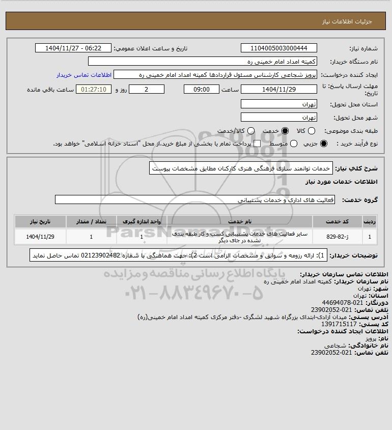 شرح کلی نیاز: خدمات توانمند سازی فرهنگی هنری کارکنان مطابق مشخصات پیوست