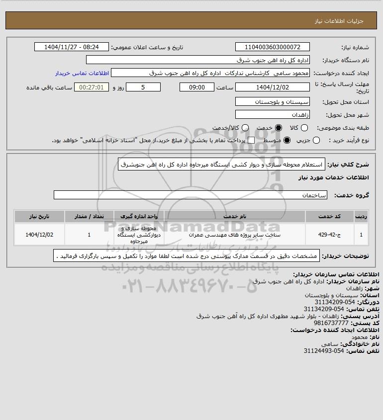 شرح کلی نیاز: استعلام محوطه سازی و دیوار کشی ایستگاه میرجاوه اداره کل راه اهن جنوبشرق