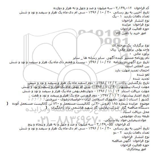 موضوع مزایده شماره ١٨٥ (فروش ٨٠ تن کاتالیست مستعمل و ٧٢٠ تن کاتالیست مستعمل آلوده)