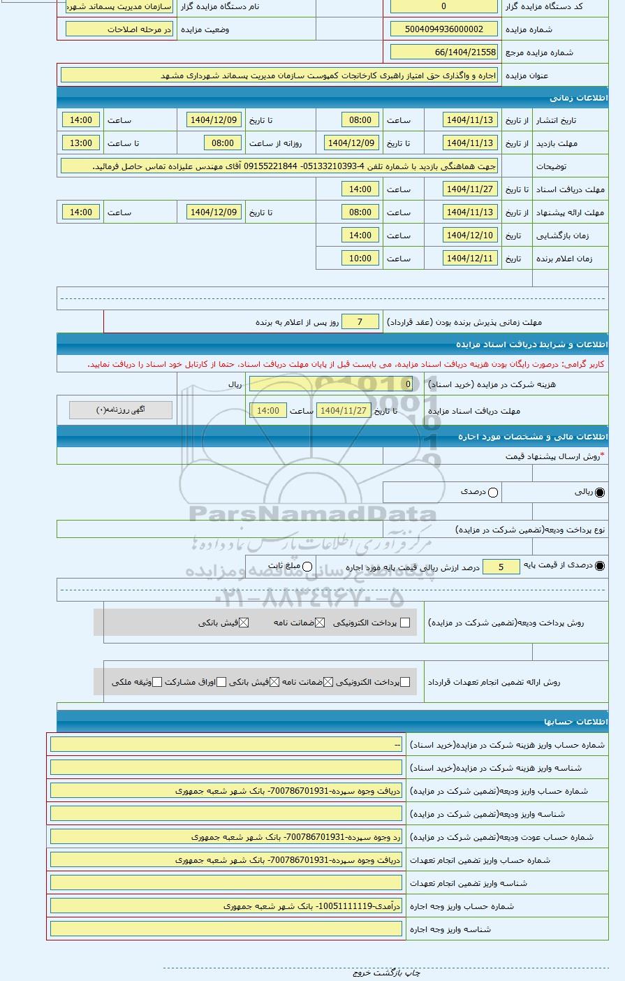 شماره مورد اجاره5104094936000003نوع برگزاری مزایده مزایده عمومی