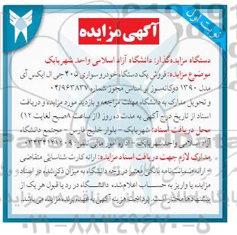 موضوع مزایده: فروش یکدستگاه خودرو سواری 405 جی ال ایکس آی مدل 1390 دوگانه سوز براساس مجوز شماره 04/963837 و تحویل مدارک به دانشگاه مهلت مراجعه و بازدید مورد مزایده و دریافت اسناد از تاریخ درج آگهی به مدت ده روز (از ساعت 8 صبح لغایت 12)
