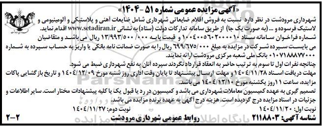 شهرداری مرودشت در نظر دارد نسبت به فروش اقلام ضایعاتی شهرداری شامل ضایعات آهنی و پلاستیکی و آلومینیومی و لاستیک فرسوده و .... ) به صورت یک جا از طریق سامانه تدارکات دولت ( ستاد ) به نشانی سایت ستاد ایران اقدام نماید. شماره فراخوان سامانه ستاد 1004005602000010 و قیمت پایه 13.993.500.000 ریال میباشد و متقاضیان می بایست سپرده شرکت در مزایده به مبلغ 699.675.000 ریال را به صورت ضمانت نامه بانکی یا واریز به حساب سپرده به شماره 0107188877000 بانک ملی شعبه مرکزی مرودشت ارائه نمایند چنانچه نفرات اول تا سوم به ترتیب حاضر به انعقاد قرارداد نگردند سپرده آنان به نفع شهرداری ضبط میشود مهلت دریافت اسناد 1404.11.28 و مهلت ارسال پیشنهاد تا پایان وقت اداری روز شنبه مورخ 1404.12.09 و تاریخ بازگشایی پاکات مزایده ساعت 11 روز یکشنبه مورخ 1404.12.10 می باشد. تصمیم گیری بعهده کمیسیون معاملات شهرداری میباشد و کمیسیون در رد یا قبول یک یا کلیه پیشنهادات مختار است . سایر اطلاعات و جزئیات در اسناد مزایده درج گردیده است. هزینه درج آگهی به عهده برنده مزایده می باشد . نوبت اول : 1404.11.20 نوبت دوم : 1404.11.27