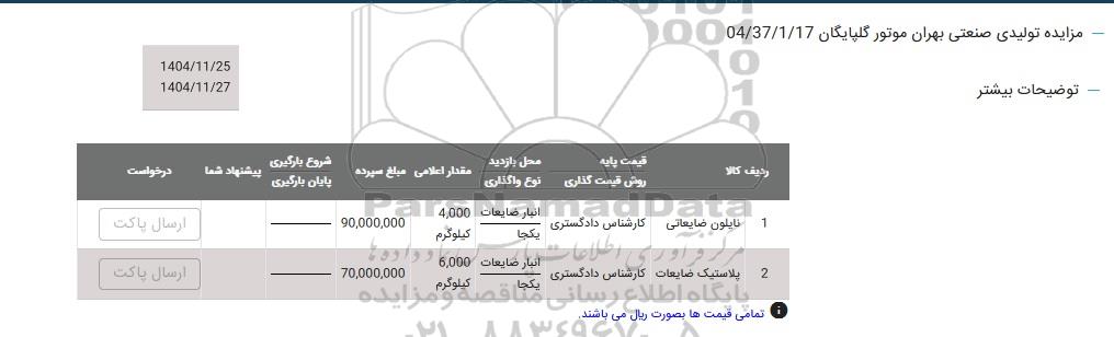 مزایده عمومی مزایده نایلون ضایعاتی برگزار میگردد. از کلیه افراد متخصص و شرکتهای واجد شرایط دعوت به عمل میآید تا در این مزایده با کد خبرگزاری پارس نماد : 10316163 شرکت نمایند تاریخ شروع مزایده : 1404/11/26 مهلت شرکت در مزایده: تا پایان روز 1404/11/27 مکان برگزاری اموال واگذاری استانهای مزایدات استان اصفهان و دستهبندیهای مربوط به این حراجی پلاستیک ، پلی اتیلن و مستر بچ میباشد.