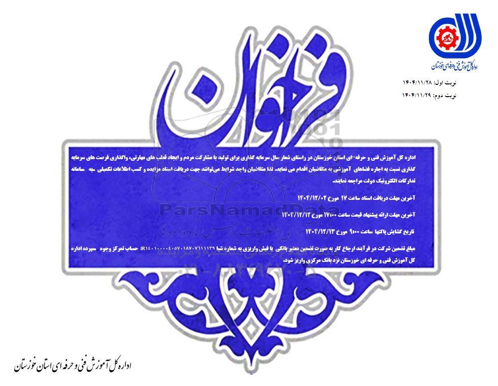 اداره کل آموزش فنی و حرفه ای استان خوزستان در راستانی شعار سال سرمایه گذاری برای تولید با مشارکت مردم و ایجاد قطب های مهارتی، واگذاری فرصت های سرمایه گذاری نست به اجاره فضاهای آموزشی به متقاضیان اقدام می نماید، لذا متقاضیان واجد شرایط می توانند جهت دریافت اسناد مزایده و کسب اطلاعات تکمیلی به سامانه تدارکات الکترونیکی دولت ستاد مراجعه نمایند.
