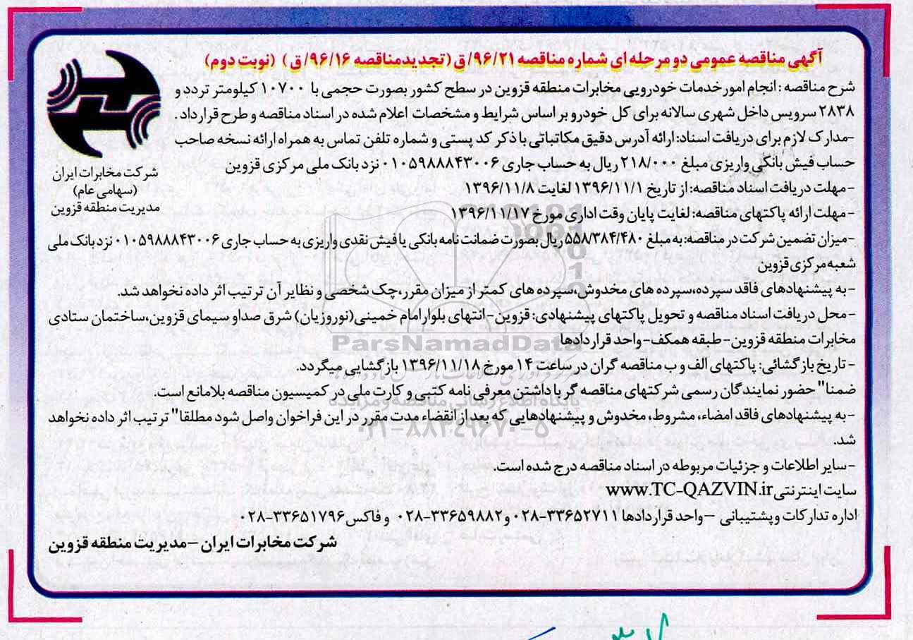 شماره 96/21 / ق (تجدید مناقصه 96/16/ ق)