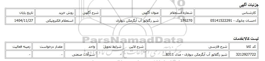 | احسان چابوک - 05141522291 | 176270 | شیر رگلاتور آب آبگرمکن دیواری | استعلام الکترونیکی | 1404/11/27 |
