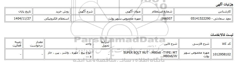 | محمد سعادتی - 05141522290 | 166007 | مهره مخصوص سوپر بولت | استعلام الکترونیکی | 1404/11/27 |