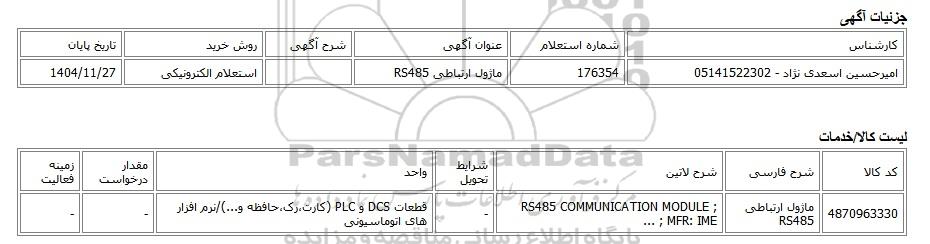 | امیرحسین اسعدی نژاد - 05141522302 | 176354 | ماژول ارتباطی RS485 | استعلام الکترونیکی | 1404/11/27 |