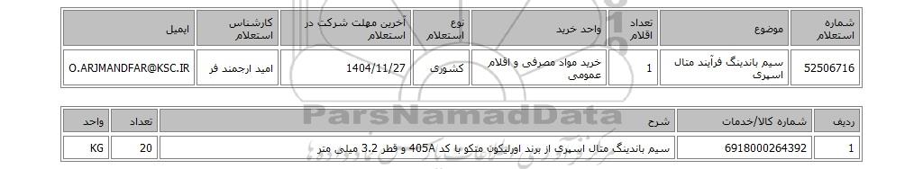 | 52506716 | سیم باندینگ فرآیند متال اسپری | 1 | خرید مواد مصرفی و اقلام عمومی | کشوری | 1404/11/27 | امید ارجمند فر | O.ARJMANDFAR@KSC.IR |
