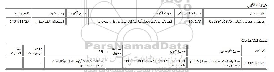 | مرتضی جمالی شاد - 05138451875 | 167173 | اتصالات فولادی/فولادآلیاژی/گالوانیزه درزدار و بدون درز | استعلام الکترونیکی | 1404/11/27 |