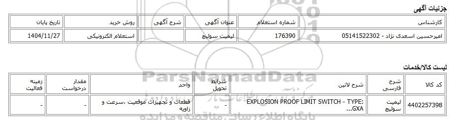 | امیرحسین اسعدی نژاد - 05141522302 | 176390 | لیمیت سوئیچ | استعلام الکترونیکی | 1404/11/27 |