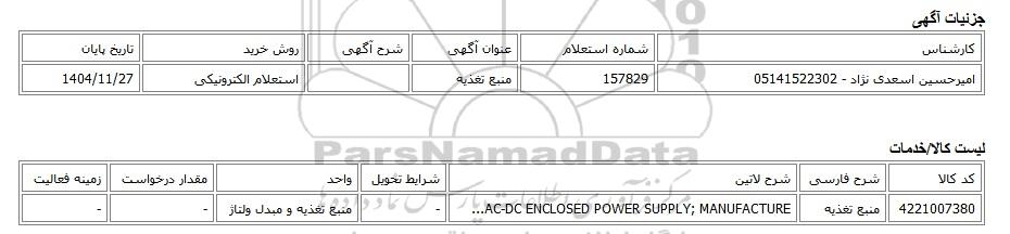 | امیرحسین اسعدی نژاد - 05141522302 | 157829 | منبع تغذیه | استعلام الکترونیکی | 1404/11/27 |