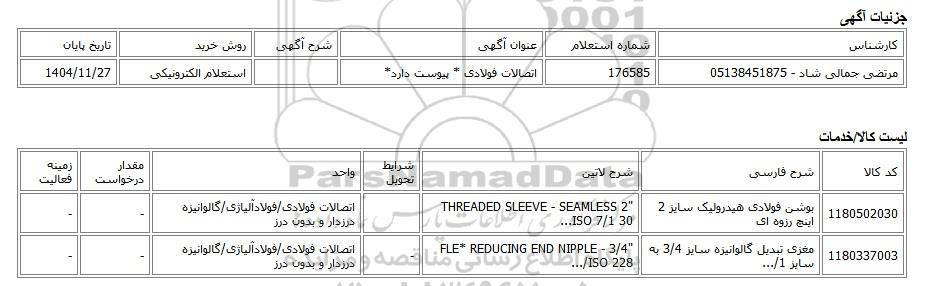 | مرتضی جمالی شاد - 05138451875 | 176585 | اتصالات فولادی * پیوست دارد* | استعلام الکترونیکی | 1404/11/27 |