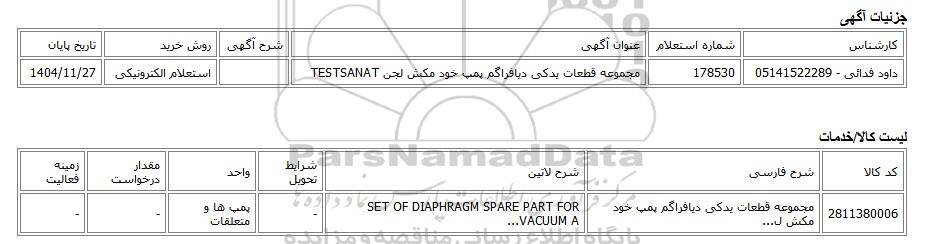استعلام الکترونیکی مجموعه قطعات یدکی دیافراگم پمپ خود مکش لجن TESTSANAT, استعلام الکترونیکی، مجموعه قطعات یدکی دیافراگم پمپ خود مکش لجن TESTSANAT