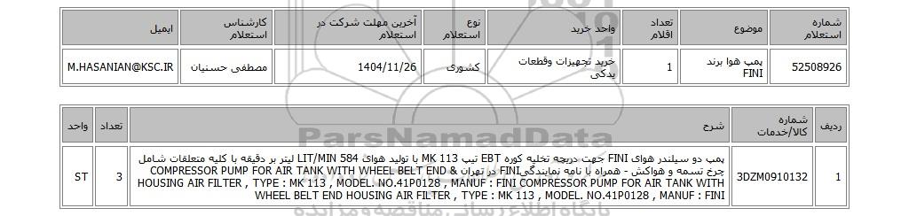 | 52508926 | پمپ هوا برند FINI | 1 | خرید تجهیزات وقطعات یدکی | کشوری | 1404/11/26 | مصطفی حسنیان | M.HASANIAN@KSC.IR |