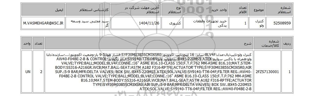 | 52508959 | کنترل ولو | 1 | خرید تجهیزات وقطعات یدکی | کشوری | 1404/11/26 | سید مجتبی سید وسمه گر | M.VASMEHGAR@KSC.IR |