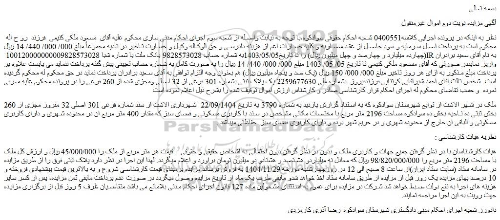 نظر به اینکه در پرونده اجرایی کلاسه0400551 شعبه احکام حقوقی سوادکوه،با توجه به نیابت واصله از شعبه سوم اجرای احکام مدنی ساری محکوم علیه آقای مسعود ملکی کنیمی فرزند رو ح اله محکوم است به پرداخت اصل سرمایه و سود حاصل از عقد مضاربه و کلیه خسارات اعم از هزینه دادرسی و حق الوکاله وکیل و خسارت تاخیر در تادیه مجموعاً مبلغ 000/ 000/ 440/ 14 ریال (چهارده میلیارد و چهارصد و چهل میلیون ریال) را تا تاریخ1403/05/05به شماره حساب 9828573028 بانک ملت با شماره شبا 100120000000009828573028 ir به نام آقای سعید برادران واریز نمایددر صورتی که آقای مسعود ملکی کنیمی تا تاریخ 05/ 05/ 1403 مبلغ 000/ 000/ 440/ 14 ریال را به صورت کامل به شماره حساب تعیینی پیش گفته پرداخت ننماید می بایست علاوه بر پرداخت مبلغ مذکور به ازای هر روز تاخیر مبلغ 000/ 000/ 150 ریال (یک صد و پنجاه میلیون ریال) هم بعنوان وجه التزام توافقی به آقای سعید برادران پرداخت نماید در حق محکوم له محکوم گردیده است. شخص ثالث اقای احمد شیراقایی کوتنایی فرزندفیروز بشماره ملی 2259677630 یک پلاک ثبتی بشماره 301 فرعی از 32 اصلی ومجزی شده از 260 فرعی را در پرونده محکوم علیه معرفی نموده و حسب تقاضای محکوم له اجرای احکام قرار کارشناسی صادر و کارشناس ارزش اموال توقیف شده را بشرح ذیل اعلام نموده است
