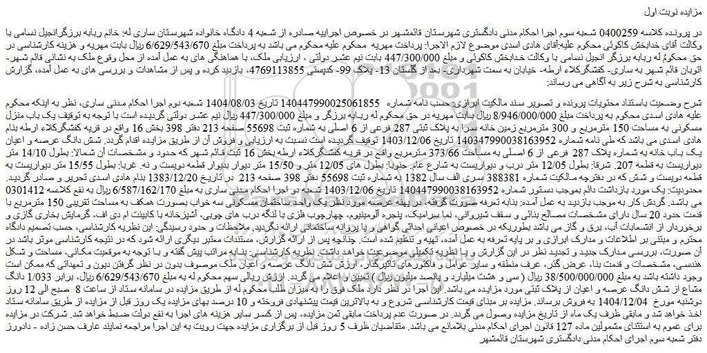 شرح وضعیت باستناد محتویات پرونده و تصویر سند مالکیت ابرازی: حسب نامه شماره  140447990025061855 تاریخ 1404/08/03 شعبه دوم اجرا احکام مدنی ساری، نظر به اینکه محکوم علیه هادی اسدی محکوم به پرداخت مبلغ 8/946/000/000 ریال بابت مهریه در حق محکوم له ربابه برزگر و مبلغ 447/300/000 ریال نیم عشر دولتی گردیده است با توجه به توقیف یک باب منزل مسکونی به مساحت 150 مترمربع و 300 مترمربع زمین خانه سرا به پلاک ثبتی 287 فرعی از 6 اصلی به شماره ثبت 55698 صفحه 213 دفتر 398 بخش 16 واقع در قریه کفشگرکلاء ارطه بنام هادی اسدی می باشد که طی نامه شماره 140347990038163952 تاریخ 1403/12/06 توقیف گردیده است نسبت به ارزیابی و فروش آن از طریق مزایده اقدام گردد. شش دانگ عرصه و اعیان یک باب خانه به شماره پلاک 287 فرعی از 6 اصلی به مساحت 373/66 مترمربع واقع در قریه کفشگرکلاء ارطه بخش 16 ثبت قائم شهر که حدود و مشخصات آن شمالا: بطول 14/10 متر دیواریست به قطعه 207. شرقا: بطول 12/05 متر درب و دیواریست به شارع عام. جنوبا: بطول های 12/05 متر و 15/50 متر دیوار بدیوار قطعه دویست و نه. غربا: بطول 15/55 متر دیواریست به قطعه دویست و شش که در دفترچه مالکیت شماره 388381 سری الف سال 1382 به شماره ثبت 55698 دفتر 398 صفحه 213  در تاریخ 1383/12/20 بنام هادی اسدی تحریر و صادر گردید. محدودیت: یک مورد بازداشت دائم بموجب دستور شماره 140447990038163952 تاریخ 1403/12/06 شعبه دو اجرا احکام مدنی ساری به مبلغ 6/587/162/170 ریال به نفع کلاسه 0301412 می باشد. گردش کار به موجب بازدید به عمل آمده: بنابه تعرفه صورت گرفته، در پهنه عرصه مورد نظر یک واحد ساختمان مسکونی سه خواب بصورت همکف به مساحت تقریبی 150 مترمربع با قدمت حدود 20 سال دارای مشخصات مصالح بنائی و سقف شیروانی، نما سرامیک، پنجره آلومینیوم، چهارچوب فلزی با لنگه درب های چوبی، آشپزخانه با کابینت ام دی اف، گرمایش بخاری گازی و برخوردار از انشعابات آب، برق و گاز می باشد بطوریکه در خصوص اعیانی احداثی گواهی و یا پروانه ساختمانی ارائه نگردید. ملاحظات و حدود رسیدگی: این نظریه کارشناسی، حسب تصمیم دادگاه محترم و مبتنی بر اطلاعات و مدارک ابرازی و بر پایه تعرفه به عمل آمده، تهیه و تنظیم شده است. چنانچه پس از ارائه گزارش، مستندات معتبر دیگری ارائه شود که در نتیجه کارشناسی موثر باشد در آن صورت، بررسی مدارک جدید و تجدید نظر در این گزارش و یا نظریه تکمیلی موضوعیت خواهد داشت. نظریه کارشناسی: بنابه مراتب پیش گفته و با توجه به موقعیت مکانی، مساحت و شکل هندسی، مشخصات و قدمت بنا، عرض گذر، عرف منطقه و سایر عوامل و فاکتورهای تاثیرگذار، ارزش شش دانگ عرصه و اعیان ملک موصوف بدون در نظر گرفتن دیون و تعهداتی که ممکن است وجود داشته باشد به مبلغ 38/500/000/000 ریال ( سی و هشت میلیارد و پانصد میلیون ریال ) تعیین و اعلام می گردد. ارزش ریالی سهم محکوم له به مبلغ 6/629/543/670 ریال، برابر 1/033 دانگ مشاع از شش دانگ عرصه و اعیان از پلاک ثبتی مورد مزایده می باشد. این اجرا در نظر دارد ملک فوق را به میزان طلب محکوم له از طریق مزایده در سامانه ستاد از ساعت 8  صبح الی 12 روز دوشنبه مورخ  1404/12/04 به فروش برساند. مزایده بر مبنای قیمت کارشناسی شروع و به بالاترین قیمت پیشنهادی فروخته و 10 درصد بهای مزایده یک روز قبل از مزایده از طریق سامانه ستاد اخذ خواهد شد و مابقی ظرف یک ماه از تاریخ مزایده وصول می گردد. در صورت عدم پرداخت مابقی ثمن مزایده، پس از کسر سایر هزینه های اجرا به نفع دولت ضبط خواهد شد. شرکت در مزایده برای عموم به استثنای مشمولین ماده 127 قانون اجرای احکام مدنی بلامانع می باشد. متقاضیان ظرف 5 روز قبل از برگزاری مزایده جهت رویت به این اجرا مراجعه نمایند عارف حسن زاده - دادورز دفتر شعبه سوم اجرای احکام مدنی دادگستری شهرستان قائمشهر