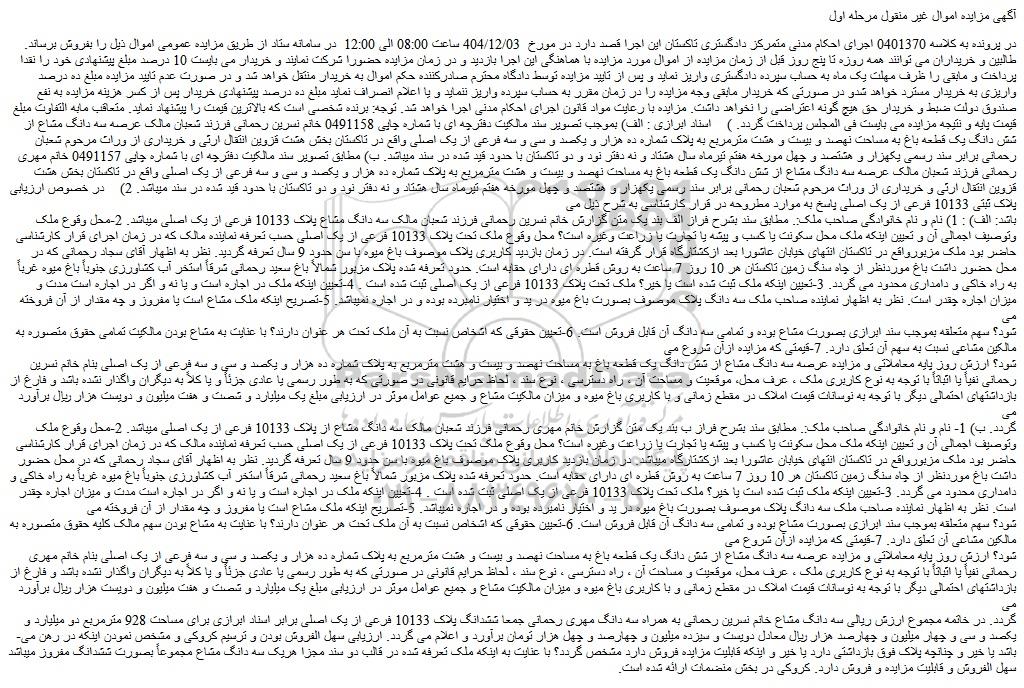 در پرونده به کلاسه 0401370 اجرای احکام مدنی متمرکز دادگستری تاکستان این اجرا قصد دارد در مورخ  404/12/03 ساعت 08:00 الی 12:00  در سامانه ستاد از طریق مزایده عمومی اموال ذیل را بفروش برساند. طالبین و خریداران می توانند همه روزه تا پنج روز قبل از زمان مزایده از اموال مورد مزایده با هماهنگی این اجرا بازدید و در زمان مزایده حضورا شرکت نمایند و خریدار می بایست 10 درصد مبلغ پیشنهادی خود را نقدا پرداخت و مابقی را ظرف مهلت یک ماه به حساب سپرده دادگستری واریز نماید و پس از تایید مزایده توسط دادگاه محترم صادرکننده حکم اموال به خریدار منتقل خواهد شد و در صورت عدم تایید مزایده مبلغ ده درصد واریزی به خریدار مسترد خواهد شدو در صورتی که خریدار مابقی وجه مزایده را در زمان مقرر به حساب سپرده واریز ننماید و یا اعلام انصراف نماید مبلغ ده درصد پیشنهادی خریدار پس از کسر هزینه مزایده به نفع صندوق دولت ضبط و خریدار حق هیچ گونه اعتراضی را نخواهد داشت. مزایده با رعایت مواد قانون اجرای احکام مدنی اجرا خواهد شد. توجه: برنده شخصی است که بالاترین قیمت را پیشنهاد نماید. متعاقب مابه التفاوت مبلغ قیمت پایه و نتیجه مزایده می بایست فی المجلس پرداخت گردد. )    اسناد ابرازی : الف) بموجب تصویر سند مالکیت دفترچه ای با شماره چاپی 0491158 خانم نسرین رحمانی فرزند شعبان مالک عرصه سه دانگ مشاع از شش دانگ یک قطعه باغ به مساحت نهصد و بیست و هشت مترمربع به پلاک شماره ده هزار و یکصد و سی و سه فرعی از یک اصلی واقع در تاکستان بخش هشت قزوین انتقال ارثی و خریداری از وراث مرحوم شعبان رحمانی برابر سند رسمی یکهزار و هشتصد و چهل مورخه هفتم تیرماه سال هشتاد و نه دفتر نود و دو تاکستان با حدود قید شده در سند میباشد. ب) مطابق تصویر سند مالکیت دفترچه ای با شماره چاپی 0491157 خانم مهری رحمانی فرزند شعبان مالک عرصه سه دانگ مشاع از شش دانگ یک قطعه باغ به مساحت نهصد و بیست و هشت مترمربع به پلاک شماره ده هزار و یکصد و سی و سه فرعی از یک اصلی واقع در تاکستان بخش هشت قزوین انتقال ارثی و خریداری از وراث مرحوم شعبان رحمانی برابر سند رسمی یکهزار و هشتصد و چهل مورخه هفتم تیرماه سال هشتاد و نه دفتر نود و دو تاکستان با حدود قید شده در سند میباشد. 2)    در خصوص ارزیابی پلاک ثبتی 10133 فرعی از یک اصلی پاسخ به موارد مطروحه در قرار کارشناسی به شرح ذیل می