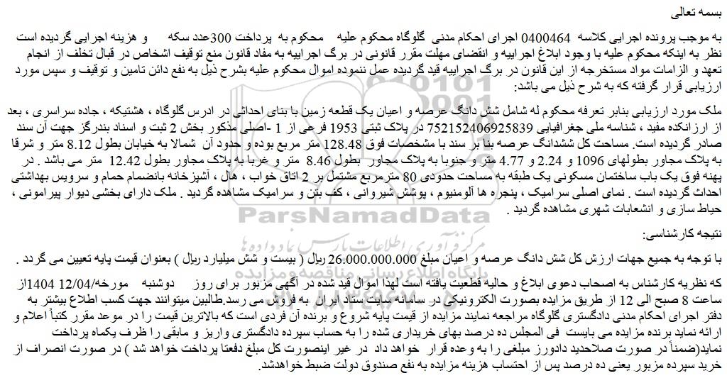 که نظریه کارشناس به اصحاب دعوی ابلاغ و حالیه قطعیت یافته است لهذا اموال قید شده در آگهی مزبور برای روز دوشنبه مورخه/12/04 1404از ساعت 8 صبح الی 12 از طریق مزایده بصورت الکترونیکی در سامانه سایت ستاد ایران به فروش می رسد.طالبین میتوانند جهت کسب اطلاع بیشتر به دفتر اجرای احکام مدنی دادگستری گلوگاه مراجعه نمایند مزایده از قیمت پایه شروع و برنده آن فردی است که بالاترین قیمت را در موعد مقرر کتباً اعلام و ارائه نماید برنده مزایده می بایست فی المجلس ده درصد بهای خریداری شده را به حساب سپرده دادگستری واریز و مابقی را ظرف یکماه پرداخت نماید(ضمناً در صورت صلاحدید دادورز مبلغی را به وعده قرار خواهد داد در غیر اینصورت کل مبلغ دفعتا پرداخت خواهد شد ) در صورت انصراف از خرید سپرده مزبور یعنی ده درصد پس از احتساب هزینه مزایده به نفع صندوق دولت ضبط خواهدشد.