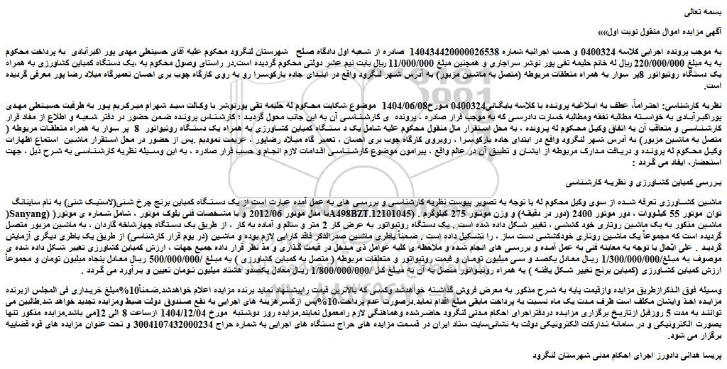به موجب پرونده اجرایی کلاسه 0400324 و حسب اجرائیه شماره 140434420000026538 صادره از شعبه اول دادگاه صلح شهرستان لنگرود محکوم علیه آقای حسینعلی مهدی پور اکبرآبادی به پرداخت محکوم به به مبلغ 220/000/000 ریال له خانم حلیمه تقی پور نوشر سراجاری و همچنین مبلغ 11/000/000 ریال بابت نیم عشر دولتی محکوم گردیده است.در راستای وصول محکوم به ،یک دستگاه کمباین کشاورزی به همراه یک دستگاه روتیواتور 8پر سوار به همراه متعلقات مربوطه (متصل به ماشین مزبور) به آدرس شهر لنگرود واقع در ابتدای جاده بارکوسرا رو به روی کارگاه چوب بری احسان تعمیرگاه میلاد رضا پور معرفی گردیده است.