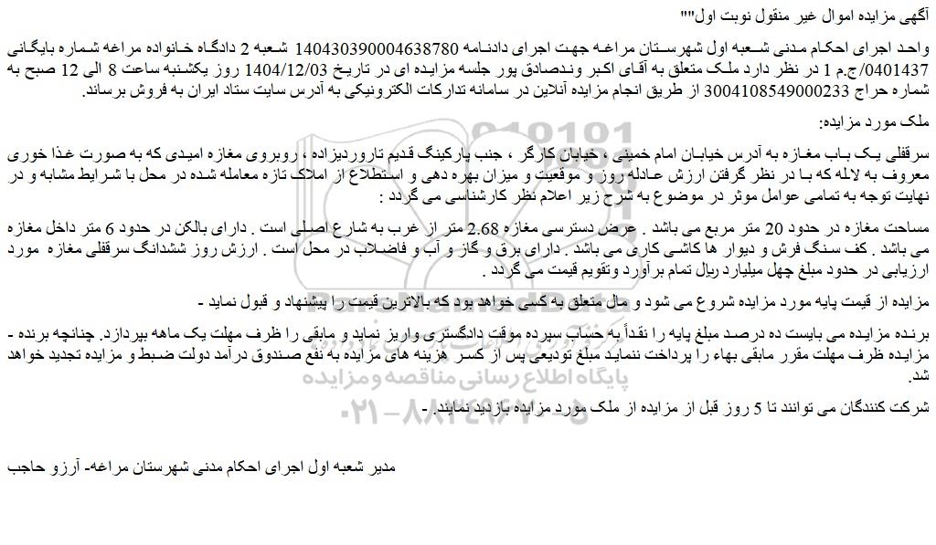 واحد اجرای احکام مدنی شعبه اول شهرستان مراغه جهت اجرای دادنامه 140430390004638780 شعبه 2 دادگاه خانواده مراغه شماره بایگانی 0401437/ج.م 1 در نظر دارد ملک متعلق به آقای اکبر وندصادق پور جلسه مزایده ای در تاریخ 1404/12/03 روز یکشنبه ساعت 8 الی 12 صبح به شماره حراج 3004108549000233 از طریق انجام مزایده آنلاین در سامانه تدارکات الکترونیکی به آدرس سایت ستاد ایران به فروش برساند.