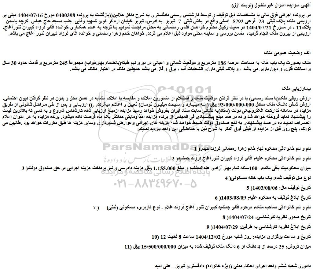 در پرونده اجرائی فوق مالی با مشخصات ذیل توقیف و توسط کارشناس رسمی دادگستری به شرح داخل هلالین((بازگشت به پرونده 0400398 مورخ 1404/07/16 مبنی بر ارزیابی ملک پلاک ثبتی 23 فرعی 5792 اصلی واقع در بخش ثبتی 7 تبریز به آدرس: تبریز-خیابان اره گر-کوی شهید وفایی- جنب مسجد حاج عباس- کوچه یاسمن -پلاک11 ، در مورخ 1404/07/21 در معیت وکیل محترم خواهان آقای رمضانی به محل مراجعت نمودیم با توجه به عدم همکاری خوانده آقای فرزاد کبیران تنورآغاج، ارزیابی از بیرون ملک انجام گردید، ضمن بررسی و معاینه محلی موارد ذیل اعلام می گردد. خواهان خانم زهرا رمضانی و خوانده آقای فرزاد کبیران تنور آغاج می باشد.
