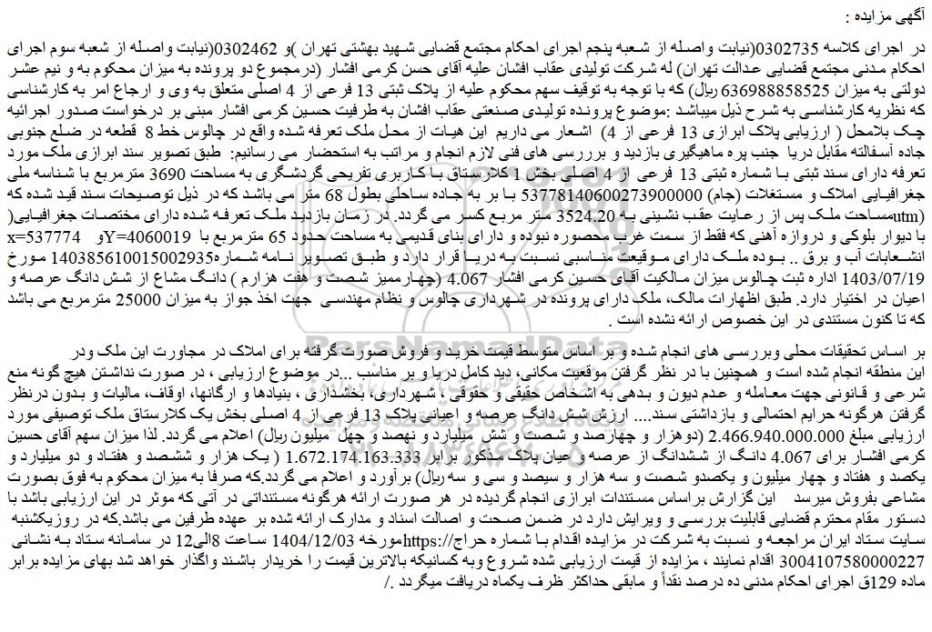 در اجرای کلاسه 0302735(نیابت واصله از شعبه پنجم اجرای احکام مجتمع قضایی شهید بهشتی تهران )و 0302462(نیابت واصله از شعبه سوم اجرای احکام مدنی مجتمع قضایی عدالت تهران) له شرکت تولیدی عقاب افشان علیه آقای حسن کرمی افشار (درمجموع دو پرونده به میزان محکوم به و نیم عشر دولتی به میزان 636988858525 ریال) که با توجه به توقیف سهم محکوم علیه از پلاک ثبتی 13 فرعی از 4 اصلی متعلق به وی و ارجاع امر به کارشناسی که نظریه کارشناسی به شرح ذیل میباشد :موضوع پرونده تولیدی صنعتی عقاب افشان به طرفیت حسین کرمی افشار مبنی بر درخواست صدور اجرائیه چک بلامحل ( ارزیابی پلاک ابرازی 13 فرعی از 4)  اشعار می داریم  این هیات از محل ملک تعرفه شده واقع در چالوس خط 8  قطعه در ضلع جنوبی جاده آسفالته مقابل دریا  جنب پره ماهیگیری بازدید و برررسی های فنی لازم انجام و مراتب به استحضار می رسانیم:  طبق تصویر سند ابرازی ملک مورد تعرفه دارای سند ثبتی با شماره ثبتی 13 فرعی از 4 اصلی بخش 1 کلارستاق با کاربری تفریحی گردشگری به مساحت 3690 مترمربع با شناسه ملی جغرافیایی املاک و مستغلات (جام) 53778140600273900000 با بر به جاده ساحلی بطول 68 متر می باشد که در ذیل توصیحات سند قید شده که مساحت ملک پس از رعایت عقب نشینی به 3524.20 متر مربع کسر می گردد. در زمان بازدید ملک تعرفه شده دارای مختصات جغرافیایی(utm) x=537774  و y=4060019  با دیوار بلوکی و دروازه آهنی که فقط از سمت غرب محصوره نبوده و دارای بنای قدیمی به مساحت حدود 65 مترمربع با انشعابات آب و برق .. بوده ملک دارای موقیعت مناسبی نسبت به دریا قرار دارد و طبق تصویر نامه شماره140385610015002935 مورخ 1403/07/19 اداره ثبت چالوس میزان مالکیت آقای حسین کرمی افشار 4.067 (چهارممیز شصت و هفت هزارم ) دانگ مشاع از شش دانگ عرصه و اعیان در اختیار دارد. طبق اظهارات مالک، ملک دارای پرونده در شهرداری چالوس و نظام مهندسی  جهت اخذ جواز به میزان 25000 مترمربع می باشد که تا کنون مستندی در این خصوص ارائه نشده است .